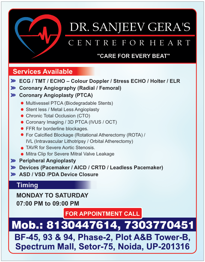Dr Sanjeev Gera's Center for Heart, BF-45, 93 & 94, Phase-2, Plot A&B Tower-B, Spectrum Mall, Setor-75, Noida, UP-201316 (Note: All interventions are performed at Fortis Hospital, Noida.)
